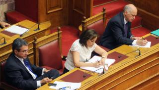 Στην ίδια κατεύθυνση και η υπουργός Παιδείας η οποία δεν δίστασε να κάνει λόγο για «πλήρωμα που σπαράσσεται». «Σε αυτήν την πολύ κρίσιμη συγκυρία που βρισκόμαστε με τη χώρα να είναι σε πέλαγος με τεράστια τρικυμία, δεν μπορεί ο πρωθυπουργός να είναι μόνος και το πλήρωμα να σπαράσσεται. Η κυβέρνηση καλείται να δείξει σιδηρά πειθαρχία και η αντιπολίτευση να καταλάβει ότι τα ψέματα τελείωσαν και να αρθεί προ των ευθυνών της. Δεν χωρούν λαϊκισμοί. Η οικονομική κρίση είναι απλώς η κορυφή του παγόβουνου , καθώς εδώ έχουν αναποδογυριστεί αξίες» τόνισε με νόημα η κυρία Διαμαντοπούλου.